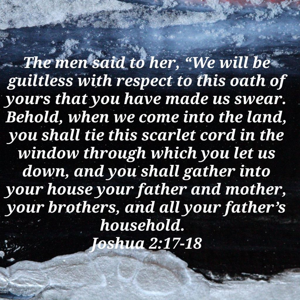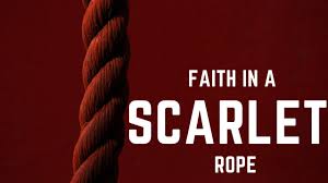 Let’s focus on Rahab’s rope. Three times in this chapter, the rope is mentioned- vs15\cord \vs 18\ lines of scarlet thread \vs 21\ scarlet line. God has a way of using things to give us messages. The Hebrew word for scarlet is שָׁנִי– shani. The word for the rope is חוּט- chut. People often call a neighbourhood’s prostitution-heavy area “the red light” district. A prostitution indicator rope customarily was the “scarlet thread”; everyone could see Rahab’s line of work. It represented the pain inextricably linked to her life—both the sorrow that had driven her to pursue that line of work and the sorrow that it had also brought her. But we can’t stop talking about that colour there. Dark red hues like scarlet and crimson are also associated with atonement. Blood is scarlet in hue, and it is the blood that washes away our guilt, shame, sin and the misery it causes. As a result, scarlet is the colour of salvation made possible by Jesus’ blood.