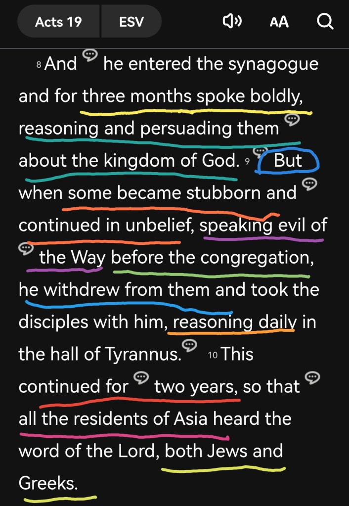 Acts 19 vs 8-10, has some interesting details that stand true in our time too.