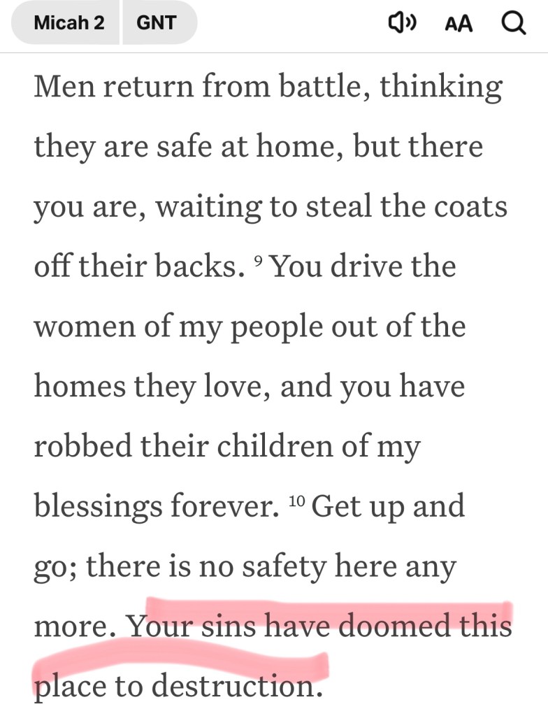 Micah 2 deals with how self-gain is the modus operandi to the point where injustice is committed through lack of fear of God. Our gentrification, or market-devaluing enterprises to snatch up homes or land from the poor, fills our pockets, but shows God our lack of care for our fellow humans.