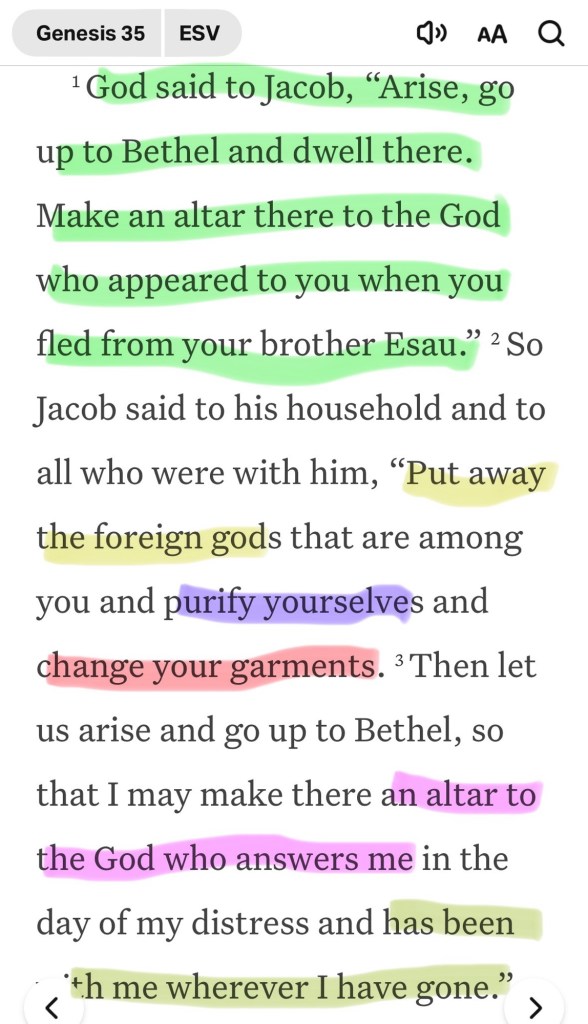 In Genesis 34 we see that by Jacob moving to where God didn’t instruct him, his daughter, Dinah, was raped, and in an act of revenge her brothers murder the men in the city, forcing Jacob and his family to flee, AGAIN. In Genesis 35, we see that Jacob is beginning to grasp that God is merciful and that he should have just obeyed God to begin with.