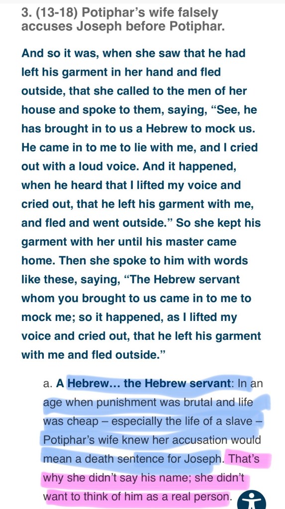 Potipher’s wife othering Joseph is so poignant as it stares down thousands of years, along the vile corridor of people hurting our own family. And, then justifying it by othering them to minimise our guilty conscience.