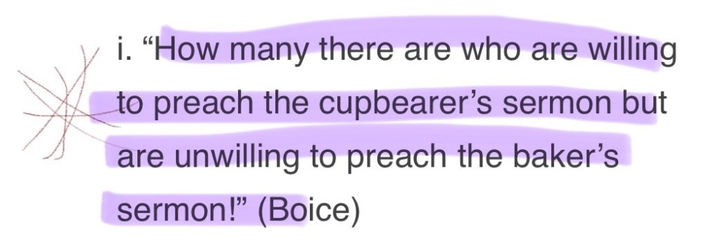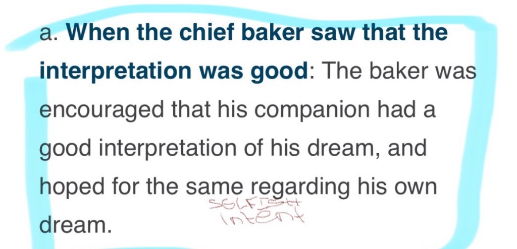 As the baker sought self-fulfilling happiness upon hearing the report of the cupbearer’s dream, don’t we ALL fall for the same error daily, seeking what makes us happy rather than what God requires so that we can be saved from the coming reality of living in the fullness of evil God set aside for our enemy that we still allow ourselves to manipulated by to eat of the tree we shouldn’t?