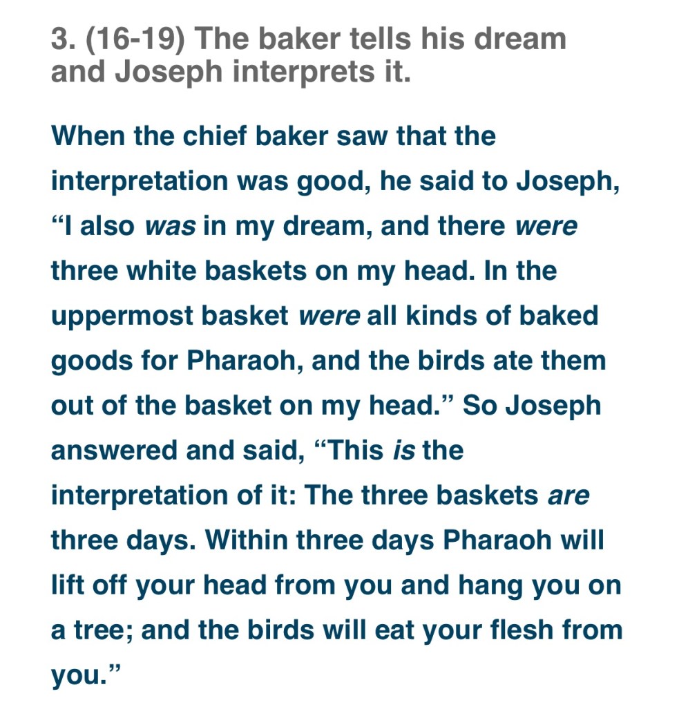 Genesis 40 vs 16-19 deals with the second dream Joseph interprets. The cupbearer receives a good report which enthuses the baker to share his dream.