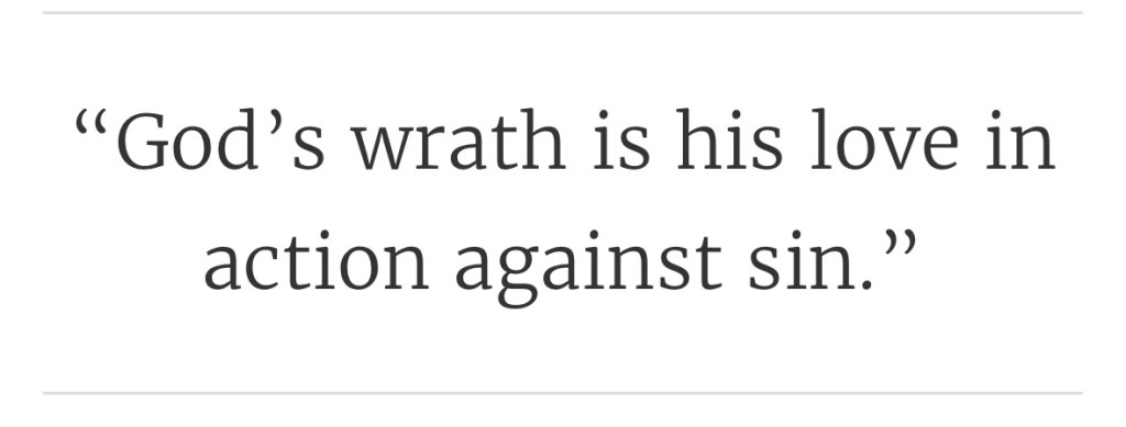 Joseph Scheumann writes for ‘Desiring God’ stating, “God’s wrath is his love in action against sin.” We see that God’s Wrath is a protective justice for what is good. Jesus tells us, Mark 10:18, “there is none good but one, that is, God.” Our sin that deserves God’s Wrath can then be understood as a direct violation against God and God just in choosing to protect Good against evil. Scheumann further expands, “God is love, and God does all things for his glory (1 John 4:8; Romans 11:36). He loves his glory above all (and that is a good thing!). Therefore, God rules the world in such a way that brings himself maximum glory. This means that God must act justly and judge sin (i.e. respond with wrath), otherwise God would not be God. God’s love for his glory motivates his wrath against sin.”