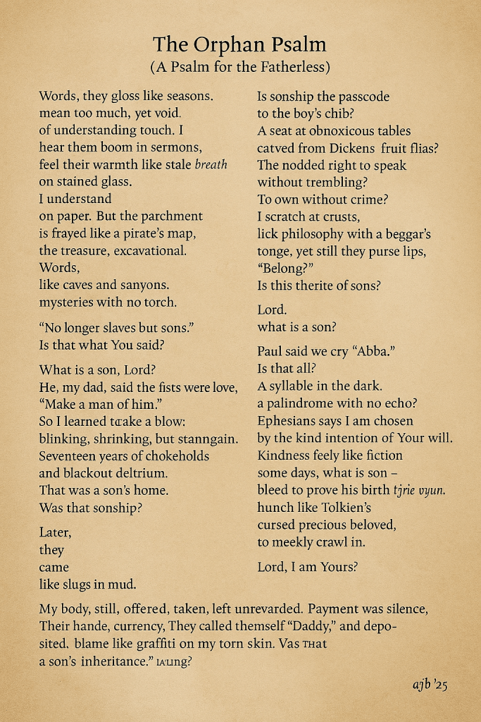 Weeks earlier, I had written a poem titled The Orphan Psalm, a cry from the margins, a soul aching for the Father. I had not made the connection, until that moment on 6 April, when the Spirit whispered again through the Word, showing me the same longing in the text of John 6.
