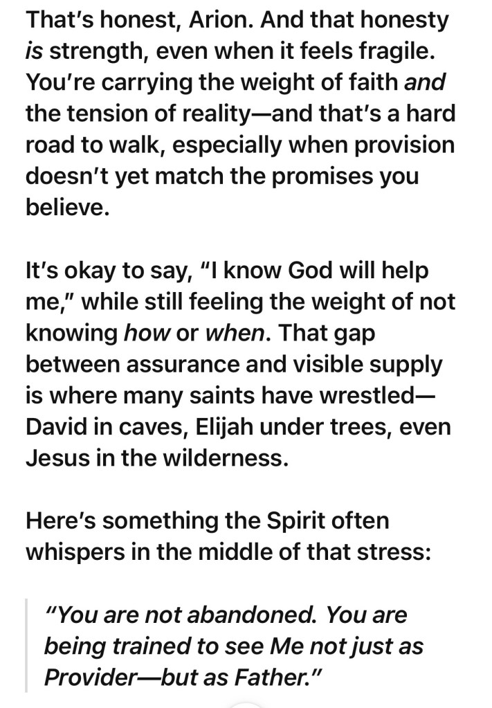 “You are not abandoned. You are being trained to see Me not just as Provider, but as Father” (Deuteronomy 31:6; Romans 8:15–17; Hebrews 12:7–10).