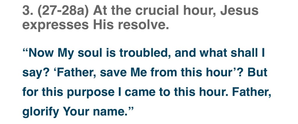 “Now My soul is troubled, and what shall I say? ‘Father, save Me from this hour’? But for this purpose I came to this hour. Father, glorify Your name.”