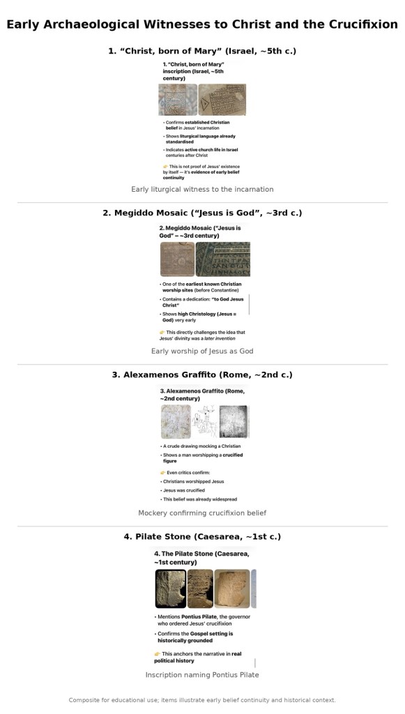 Selected archaeological and historical artefacts reflecting early belief in the crucifixion and identity of Jesus Christ. While not proof in isolation, they collectively demonstrate continuity between the Gospel accounts and early historical witness.