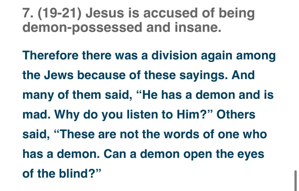 “Therefore there was again a division among the Jews because of these words. Many of them said, ‘He has a demon and is insane; why listen to Him?’ Others said, ‘These are not the words of one oppressed by a demon. Can a demon open the eyes of the blind?’” – John 10:19–21