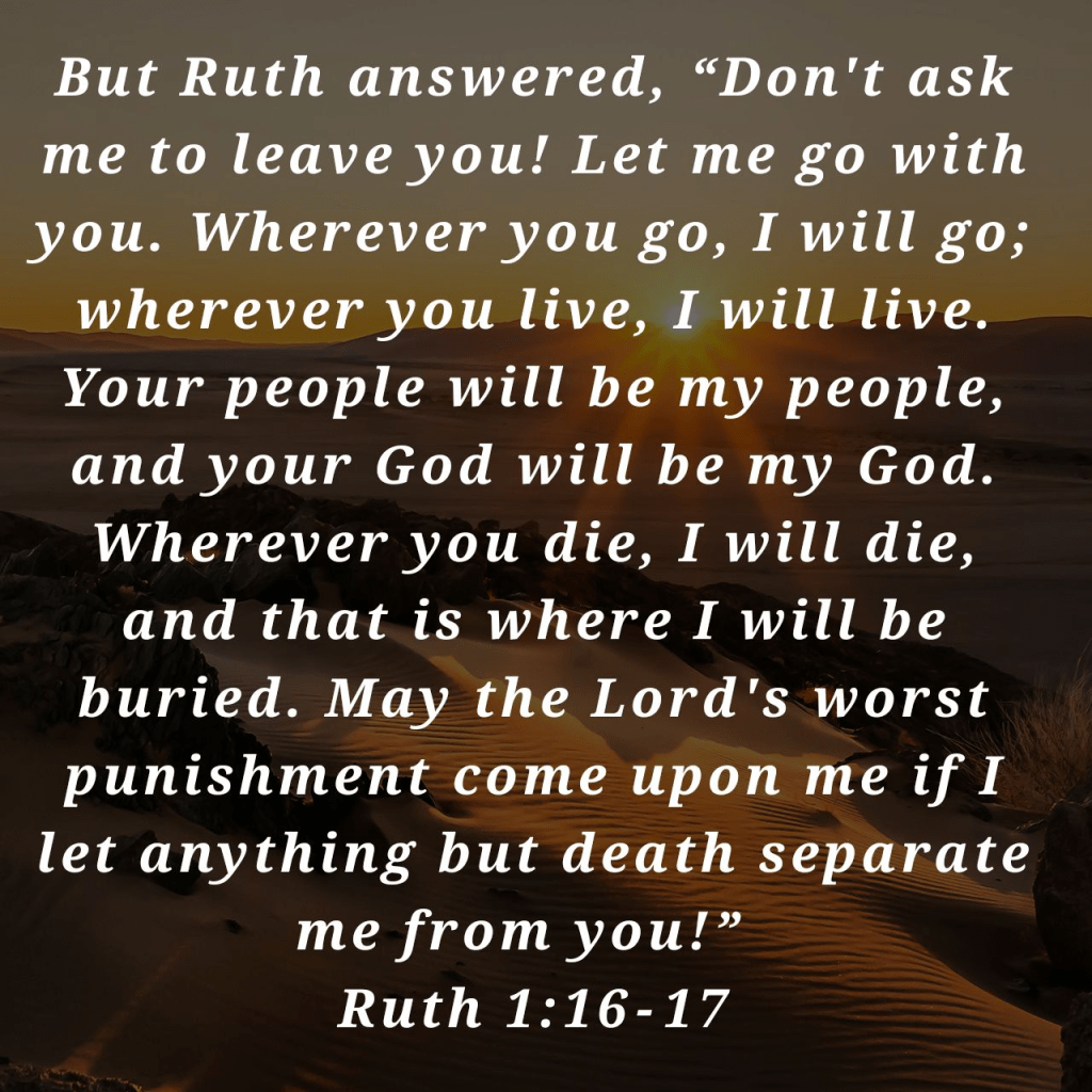I love my relationship with Messiah King Jesus. Somehow, God has a way of using what is happening in my life to prepare my soul (heart and mind) to teach me. This blog is the lesson. Interestingly, Sunday was Mother’s Day in South Africa, and my church’s Senior Pastor spoke about the importance of honouring our mothers (and fathers), as this commandment has a clause, ‘so that it may go well with you.’ I had the opportunity today to honour a lady in my church for a belated Mother’s Day. In so doing, I explained that I would write this blog about Ruth and her startling commitment to following through on her promises. As the day dragged on, I procrastinated due to Johannesburg’s winter weather.