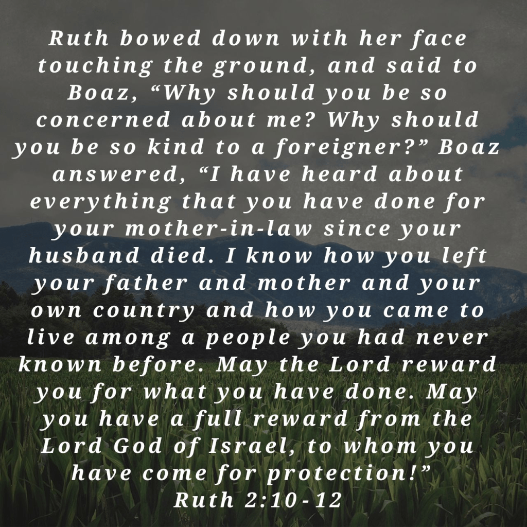 It couldn’t have been fun being a foreigner in Israel, as the culture of the day frowned on foreigners as unclean, and being a widowed woman was a burden. Dr Marty Nemko, PhD, ‘Psychology Today’, lists some tactics to help us follow through, just as Ruth did. He states, “Get comfortable being uncomfortable. Successful people realize that not everything will be pleasurable but worth the short-term discomfort in exchange for the larger long-term gain.”- https://www.psychologytoday.com/za/blog/how-to-do-life/201407/7-ways-to-make-yourself-follow-through