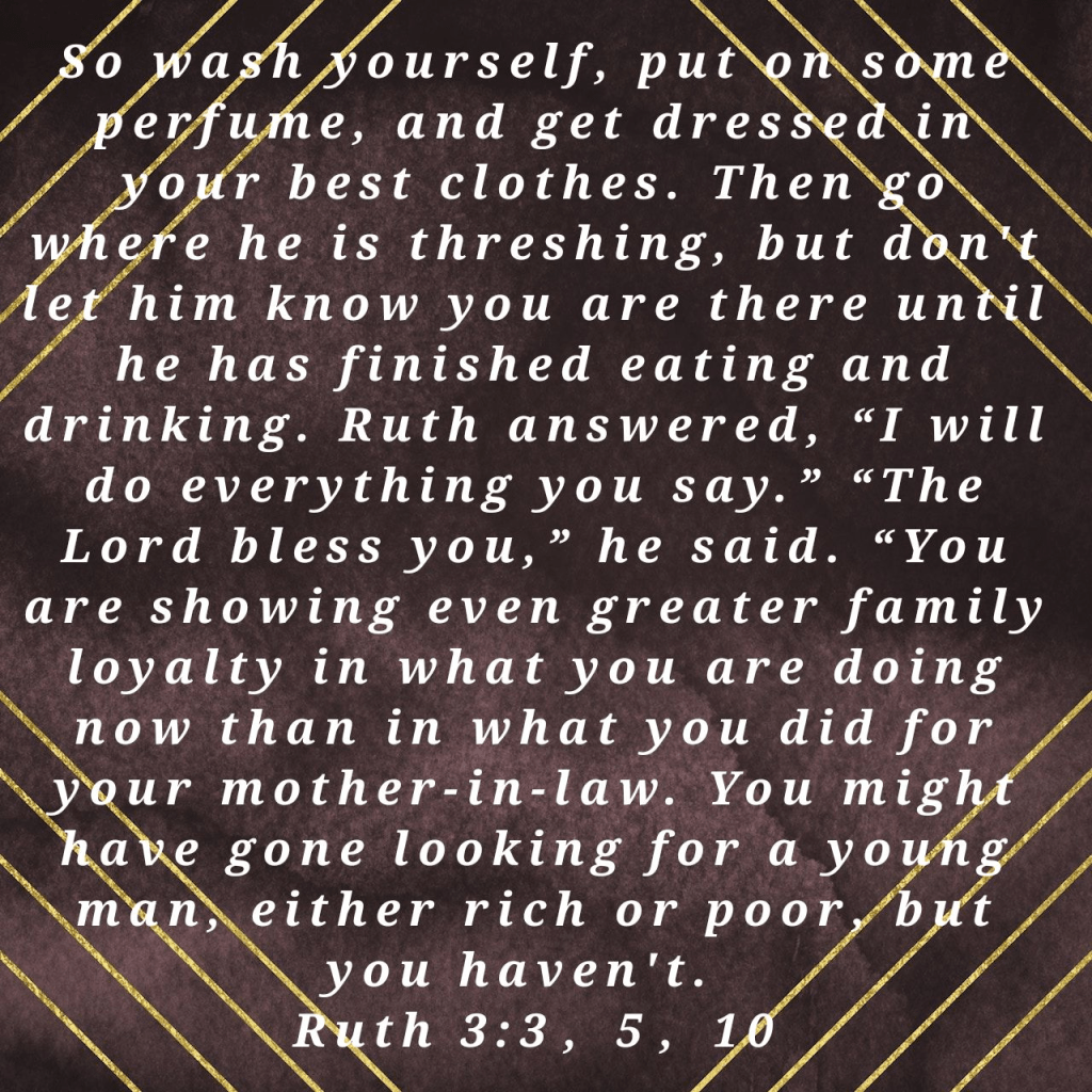 Ruth, however, shows us what true humility, in reality, looks like. She doesn’t pretend not to be a foreigner or in a dire situation but does her duty to meet her promises to her mother-in-law, which shows us such elegance of character. Something we need so much more of in our world. Upon instruction, her mother-in-law, Naomi, Ruth, follows a submission custom as she begs for care from Boaz.