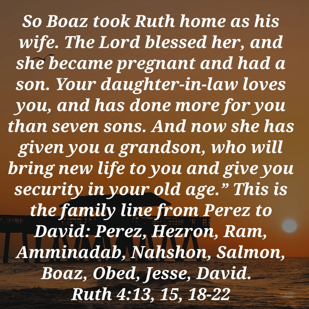 The value of commitment, no matter how awful the circumstances, is beautifully shown at the end of Ruth’s story, where she and Naomi are brought into dignity within the day’s culture.