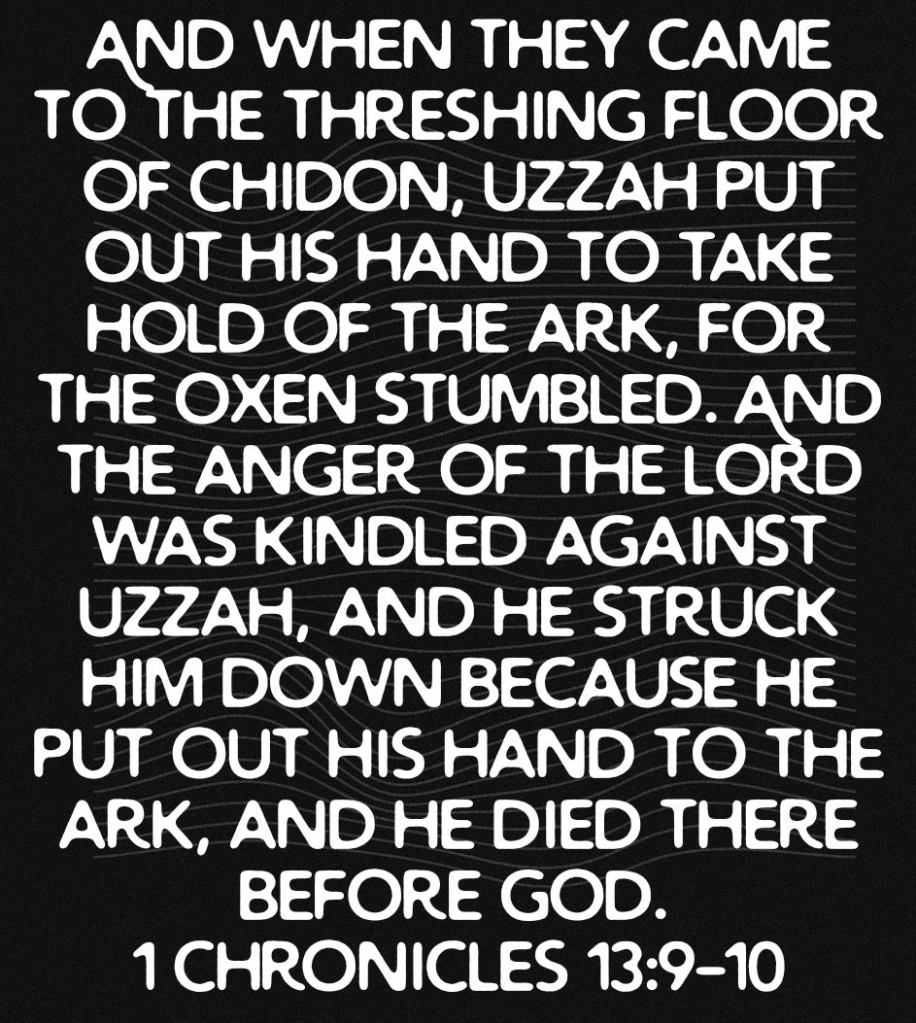‘Enduring Word’ sheds a critical understanding that we need to comprehend, practice, and repent from when we step out of turn thinking we are honouring God. To quote, ‘Much service for the LORD is like this – a new cart, a big production, with strength leading and friendly out front – yet all done without inquiring of God or looking to His will. Surely David prayed for God’s blessing on this big production, but he didn’t inquire of God regarding the production itself. This was a good thing done the wrong way.’- https://enduringword.com/bible-commentary/1-chronicles-13/