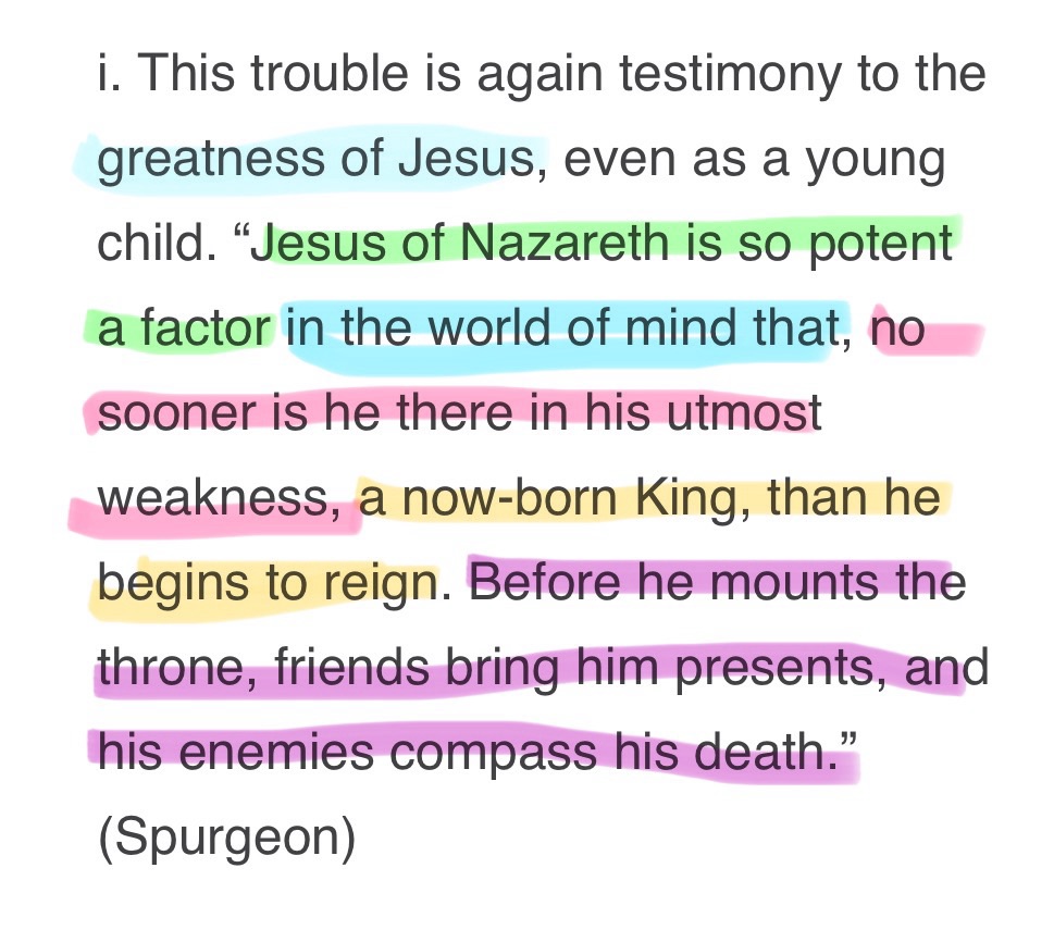 Notice the Spurgeon says in the study guide, “a now-born King, and He begins to reign.” Jesus reigns. Jesus reigns to prolifically that educated Magi bring Him gifts and a man of authority- Herod- is so threatened He wants to kill a baby to eliminate the One who reigns.