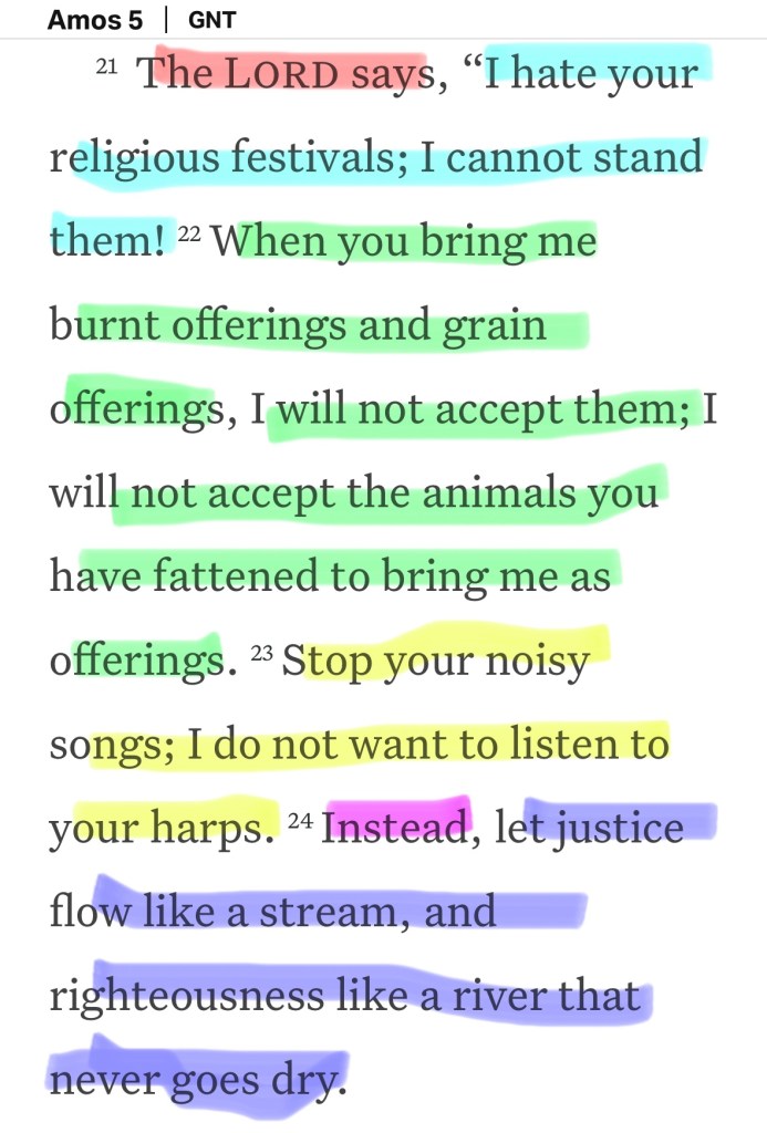 Amos 5 vs 21-24 tips my heart out of my chest and forces me to humble myself begging God to help me do more for Him.