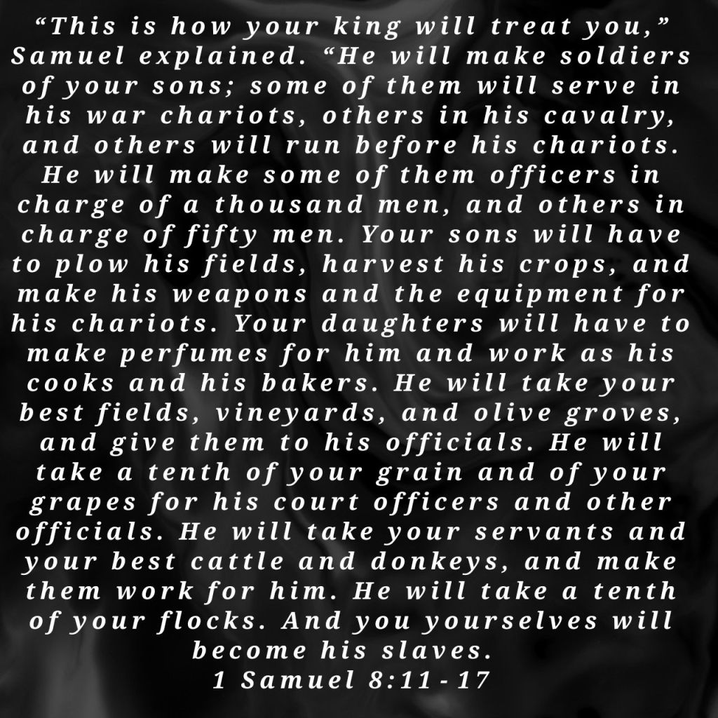 In 1 Samuel 8 vs11-17, we witness the great love of our omniscient Father. God sought to prevent the Israelites from succumbing to socialist feudalism by warning them against appointing a king who would lead them down that path. This story serves as a warning to us not to abandon God’s loving and redemptive guidance.