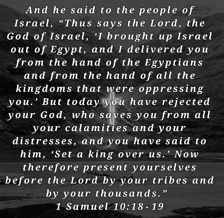 It is imperative to heed God’s warning that failing to align oneself with Him will result in both destruction and the fulfilment of one’s misguided desires. Upon first inspection, God may appear extremely brutal in 1 Samuel 2 vs 30. However, upon further examination of the backstory, we come to appreciate God’s profound longing to shield us from as much suffering as possible in this world, bound to cause us pain due to its fallen nature. 1 Samuel 10 vs 18-19, we see that God has granted the people’s wishes to be ruled by a physical king. The alarming thing is the reason the Israelites wanted a king was covetousness. The Israelites had forgotten that coveting is a sin found in the Holy Ten Commandments. 1 Samuel 8 vs 1, “Now appoint a king to lead us, such as all the other nations have.” The Israelites, who had THEE LIVING GOD, wanted to look like nations that were pagan.