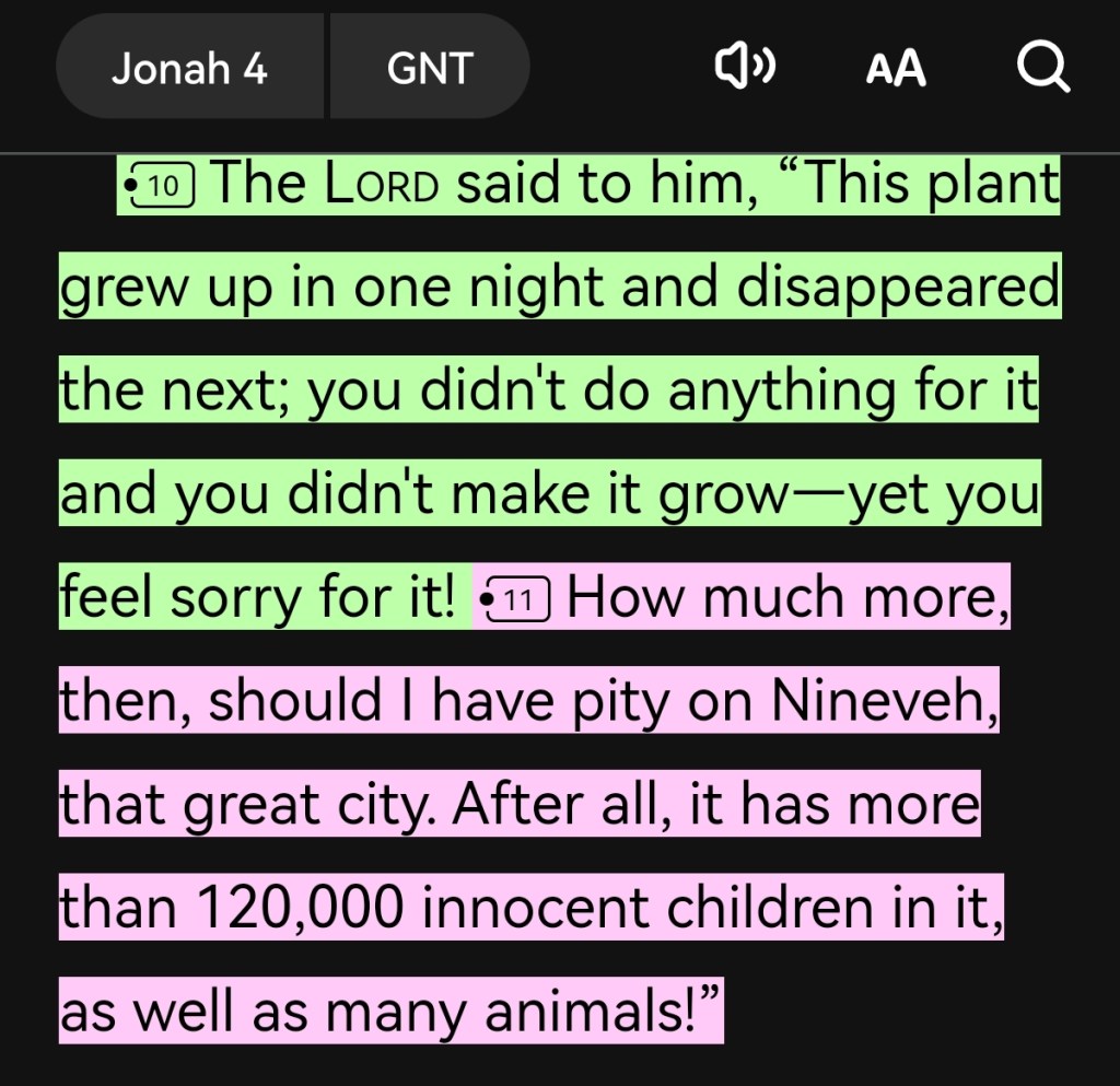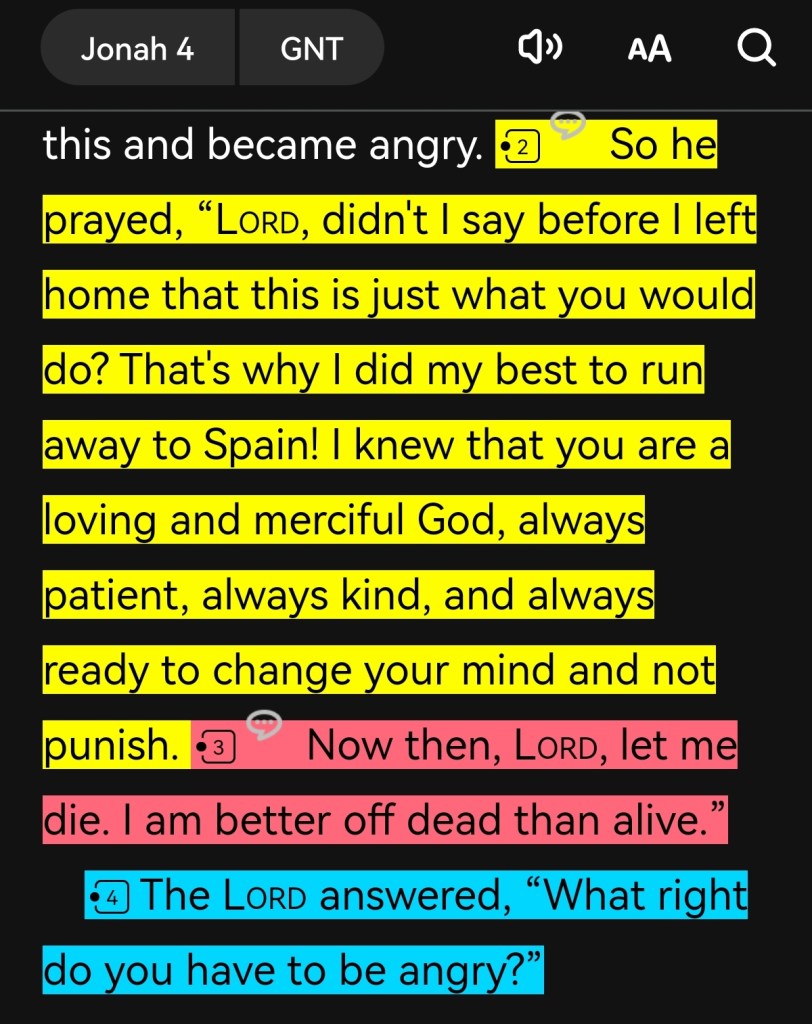 Jonah 4 shows us the depth of egoic attitude that can lead us to suicidation when what we want leads us to idolatry over God and His Salvation Plan. Kinda like wishing that murderers, pedophiles, rapists don’t get saved through repentance in Jesus because our preferential sin bias leads us to think we are better than others.