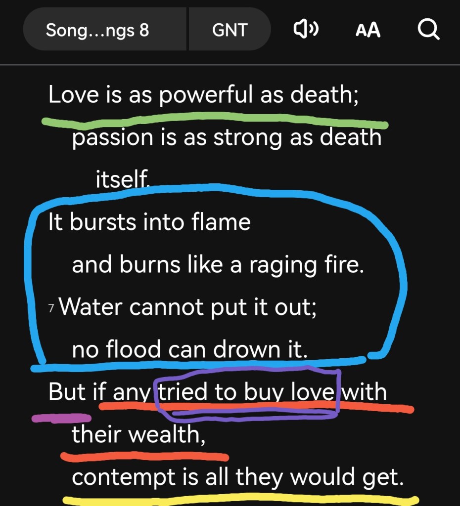 Song of Songs 8 vs 6-7 is a knock-out punch in the closing of the book. I cannot help to be drawn into God’s Purpose of putting the lesson on love after quickening our hearts by the sheer intoxicating romance of true love (SOS 8 vs 6)- a love thats hurts because one is forced to live the rest of life separate, sometimes, from the passion that consumes us when we discover true, authentic, and genuine love as God wants for us. As God feels for us.